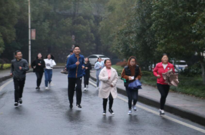 早晨的空气格外清新,天上下着绵绵细雨,花草芬芳令人心旷神怡,晨跑的脚步溢满校园。同学们精神抖擞,相互帮助,彼此鼓励,坚持跑完全程。