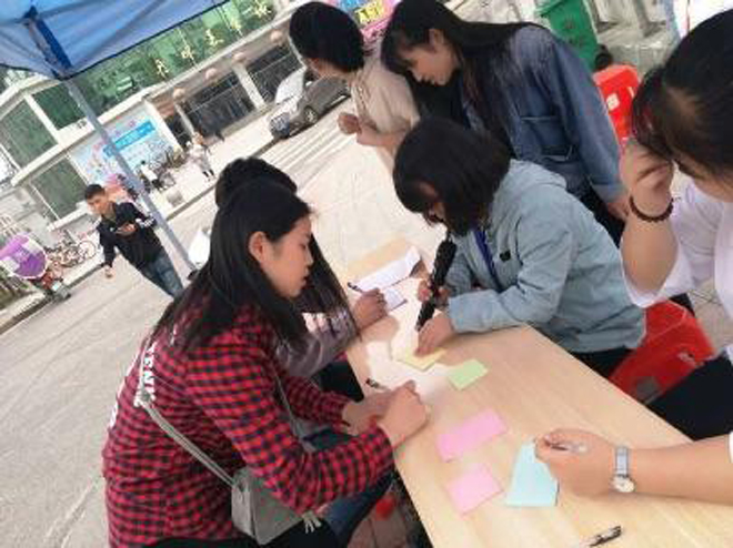 友岚湖边,信笺活动的新颖吸引了诸多学生。来往的学生纷纷驻足,与工作人员进行沟通交流并领取便利贴,有的学生当即提笔,把写好的信贴在画板上,也有学生带回宿舍写完后再交于工作人员。信笺的形式鼓励了学生将藏于内心的话语表达出来,唤起了学生心中真挚的情感。