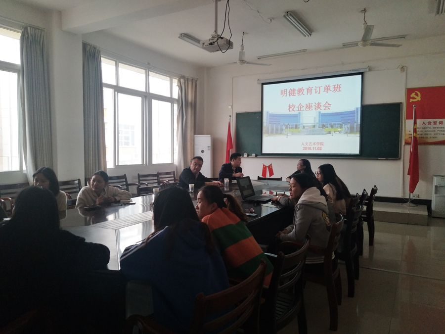 11月2日,威廉希尔足球官网举行北京明建教育订单班校企座谈会。威廉希尔足球官网院长余永欢、实习就业科科长方生元、五年一贯制学前教育教研室主任谭璇、明建教育张明总经理一行以及学生代表参加了此次座谈会。