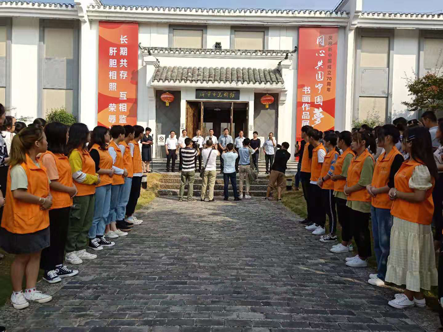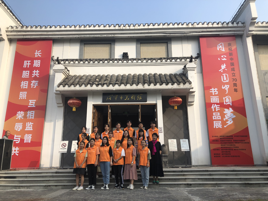 9月19日上午9点,咸宁市美术馆举行了“同心共圆中国梦”庆祝新中国成立70周年书画作品展开幕式。威廉希尔足球官网教师余娟带领18名学生志愿者代表参加了此次开幕式。