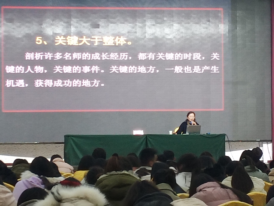 讲座中,段爱菊园长以《做一个因成长而幸福的幼儿教师》为主题,结合自己的教学生涯,从“思考好关乎成长的问题、突破导致平庸的问题、协调好影响成长的问题”作了系统阐述。主要针对“成长”的问题,提出了几点建议:第一,我们工作是为了自己,而不是为了别人,工作在于自己的兴趣爱好,对工作的热爱。第二,让对未来的期待,引领今天的生活。第三,学会为生命理财,学会为生命投资,未来将有资本拥有无尽财富。第四,无论遇到什么事情,不要去抱怨,首先反省自己。第五,对目标要持久坚持,用心把事做好,激情点燃梦想,坚持铸就辉煌!