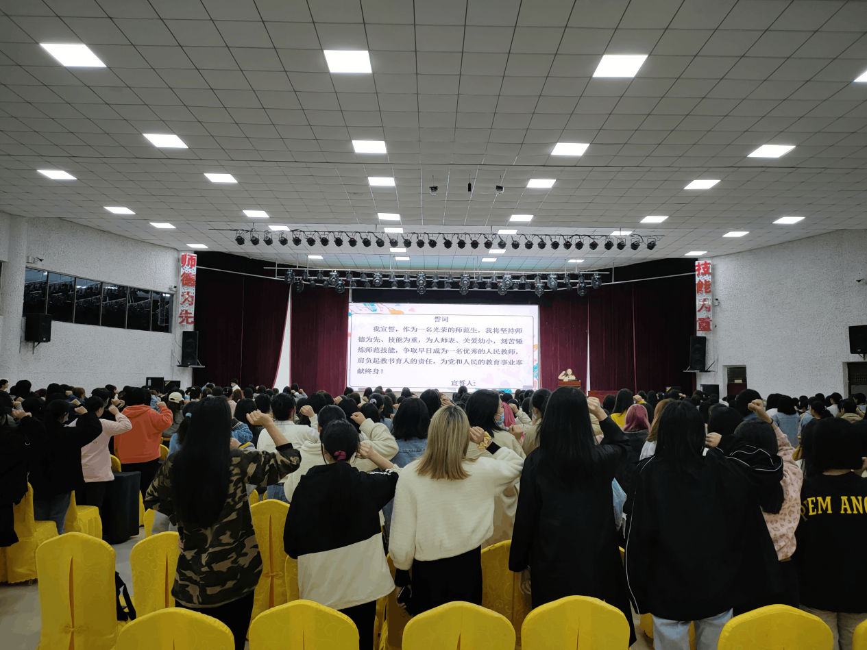 会议最后,谭璇带领全体师生起立宣誓。宣誓过程无比庄严,师生一齐大声宣读誓词,承诺将坚持师德为先、技能为重,为人师表、关爱幼小,刻苦锤炼师范技能,争取早日成为一名优秀的人民教师,肩负起教书育人的责任,为党和人民的教育事业奉献终身!