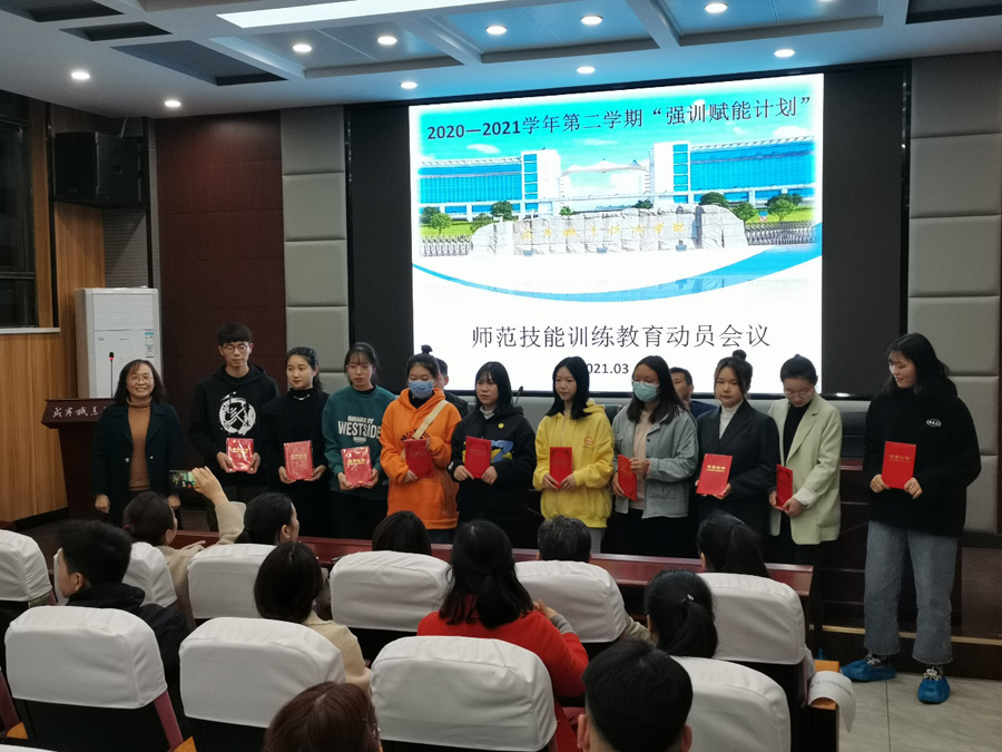 3月23日晚,威廉希尔足球官网2020—2021学年第二学期师范技能训练教育动员大会在金玉楼报告厅举行。学院院长余永欢、分管教学工作副院长方朝阳、分管学生工作副院长杨帅,以及20级强训赋能的技能导师,20级全体辅导员、班长和学委,以及53名获得普通话一乙证书的学生参加了此次会议。