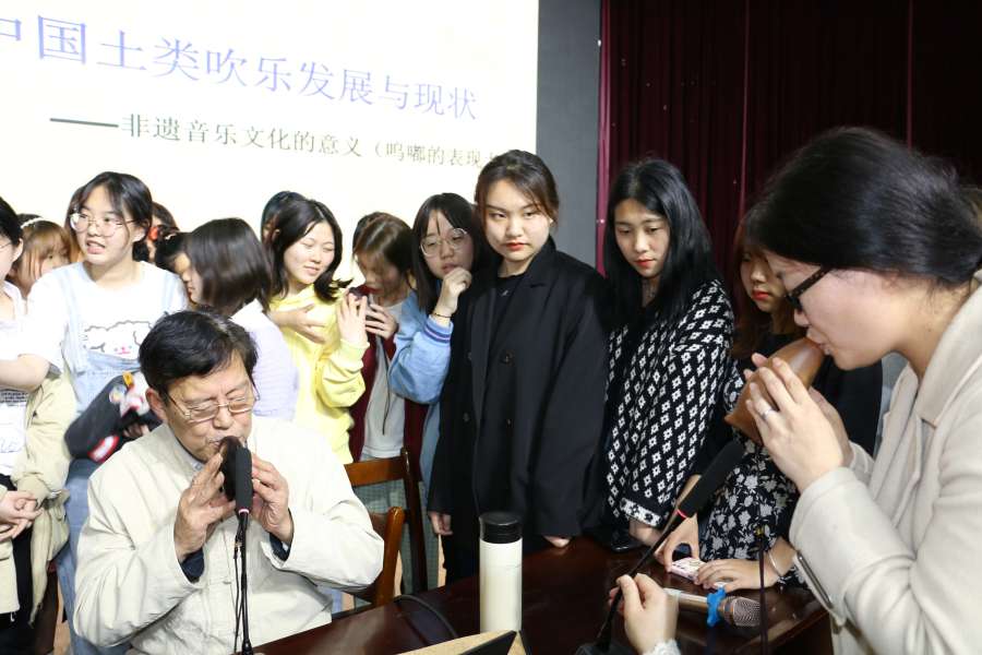 毕大师首先介绍了中国传统音乐特点和呜嘟发展历史,讲述了呜嘟为传统文化振兴和文化产业发展作出的贡献。随后通过现场演奏、师生互动,使大家感受到呜嘟的音乐特色,整场讲座气氛热烈,兼具欣赏性与体验性。