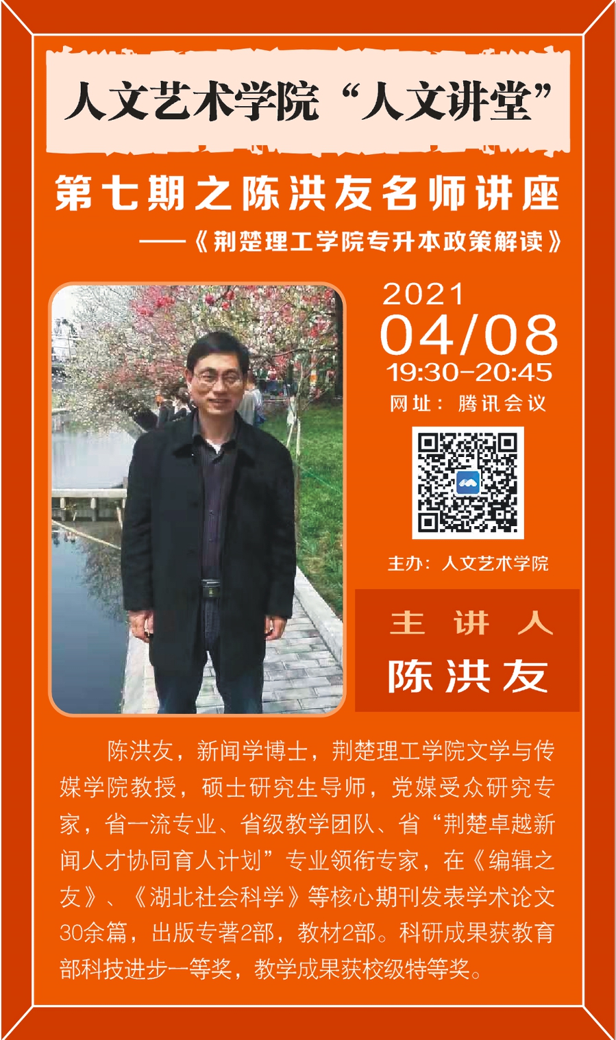 为了积极应对师范类专业学生严峻的就业形势,4月8日晚,威廉希尔足球官网举办第七期“人文讲堂”名师讲座,邀请到荆楚理工学院文学与传媒学院教授、硕士生导师陈洪友,通过线上课堂为学生作2021年专升本相关政策解读。
