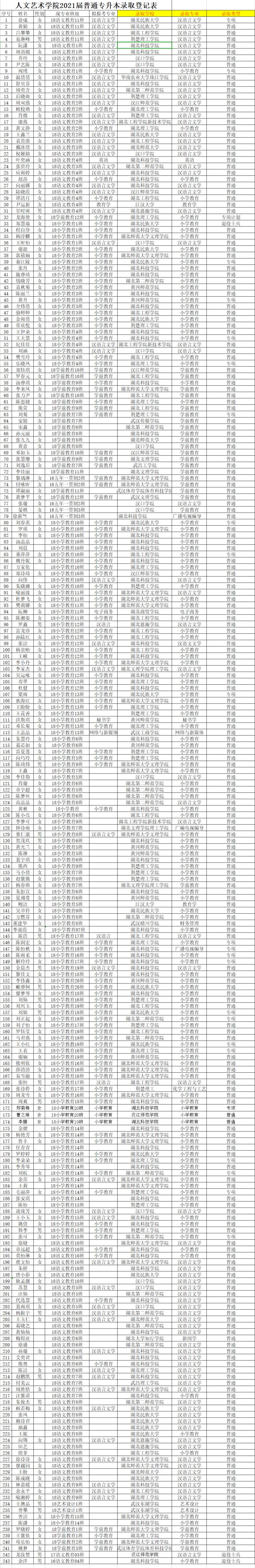 。2021年湖北省普通专升本录取工作结束,威廉希尔足球官网2021届243名优秀学子分别被湖北师范大学、湖北第二师范学院、黄冈师范学院、湖北民族大学、湖北科技学院、湖北工程学院、荆楚理工学院等27所省内本科高校录取,录取人数相较2020年的226人再创新高,录取率达到43.8%,成绩喜人。