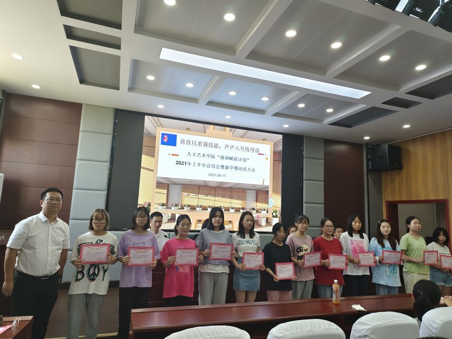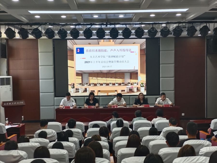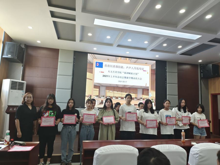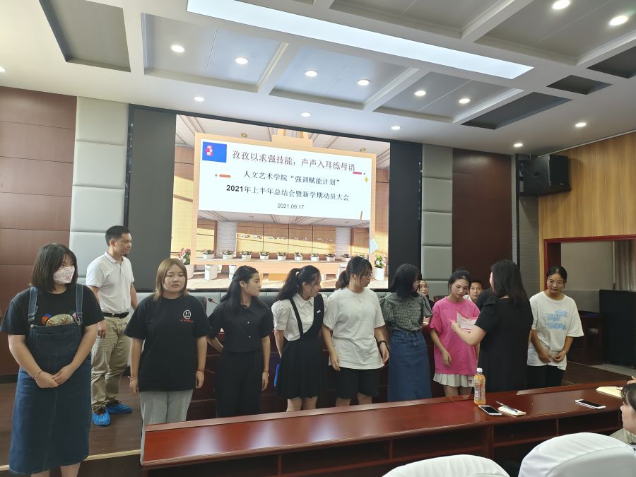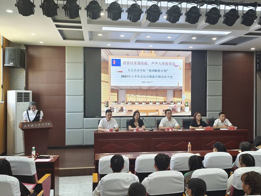此次会议,既是推普活动的一次动员大会,也是威廉希尔足球官网提质培优项目—“强训赋能计划”2021年上半年总结会暨新学期动员会。威廉希尔足球官网党务负责人韩飞、院长余永欢、语委办主任熊丹,分管教学工作副院长方朝阳、分管学生工作副院长杨帅,学生科长陈传红、教务科长刘飞兰,强训赋能计划项目负责人姜梦霞、强训赋能各项目技能训练导师、20级21级辅导员老师,以及21级各班班长、学习委员,获奖学生代表参加了此次大会。会议由方朝阳主持。