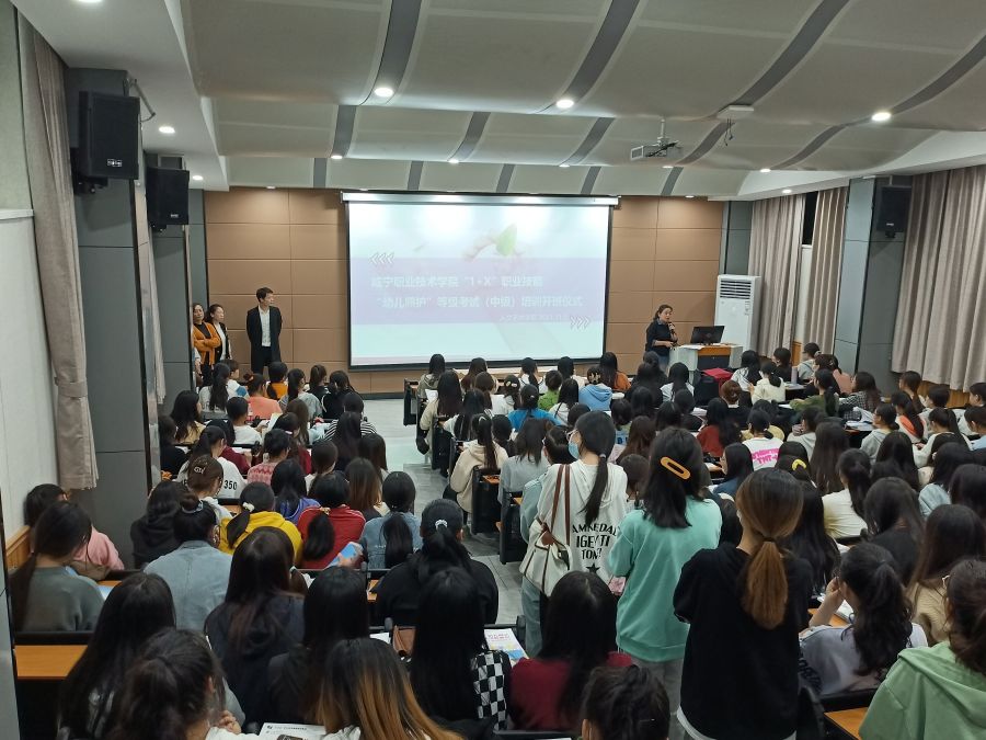 为深入贯彻国务院《国家职业教育改革实施方案》和《关于全面深化新时代教师队伍建设改革的意见》,提高我校学前教育专业学生职业发展的综合能力,11月3日晚,威廉希尔足球官网首届“1+X”幼儿照护职业技能等级证书培训班开班仪式在实训中心105正式举行。威廉希尔足球官网院长余永欢、副院长方朝阳、学前教育教研室主任谭璇及参加培训的老师和200名同学出席了开班仪式。