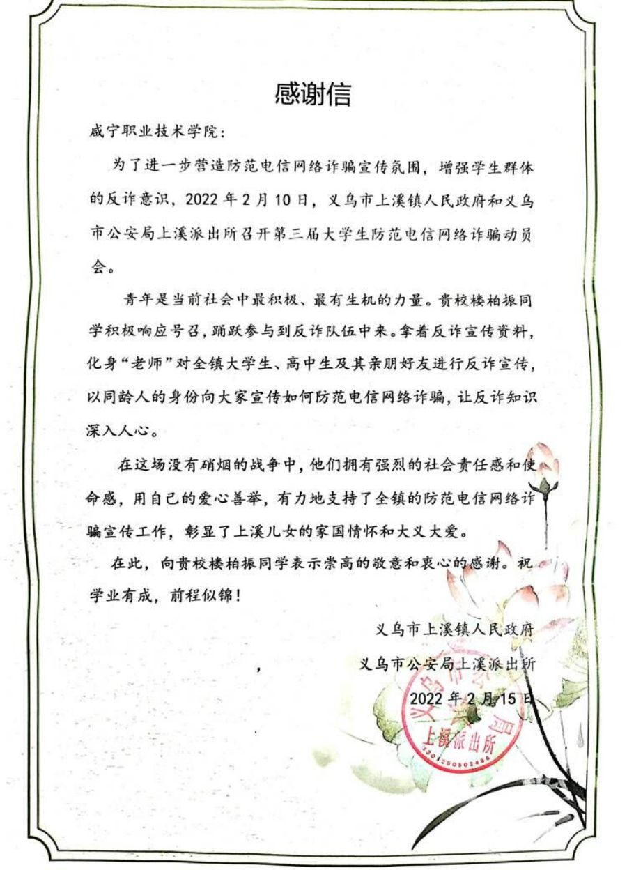 2月18日,威廉希尔足球官网辅导员甘义收到浙江省义乌市上溪镇人民政府发来的感谢信,表扬了学前专业21级学生楼柏振在反诈宣传工作中的突出表现。