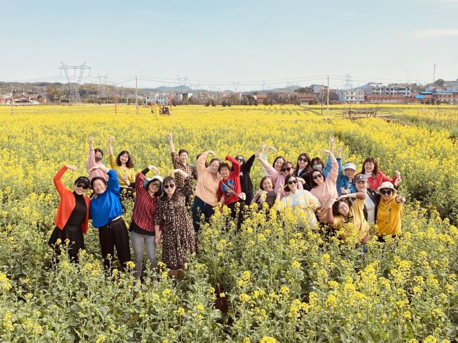 时值花朝,马桥镇建国畈油菜花基地花开遍野,片片青绿入眼,我院女教职工三五成群,在花海中漫步,或闲谈话聊,或互相拍照留念,或跳舞唱歌录视频,不亦乐乎。即将离开之时,巧遇马桥镇山歌队伍,院长余永欢带领大家在田间地头遥相呼应,共唱《山歌好比春江水》,将欢快祥和的气氛推至高潮。