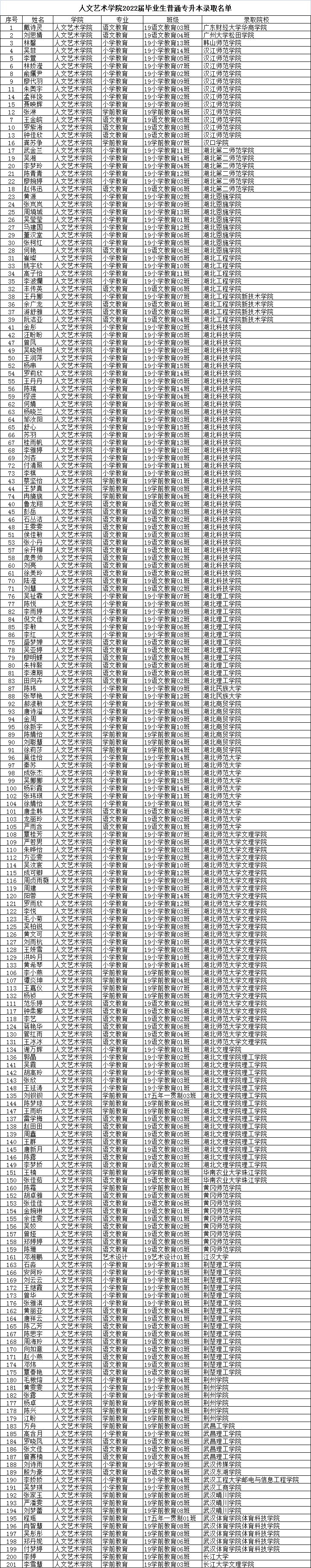 近日,2022届普通专升本考试录取结果陆续公布,威廉希尔足球官网201名毕业生分别被江汉大学、长江大学、湖北第二师范学院、湖北师范学院、湖北科技学院等本科学校录取。