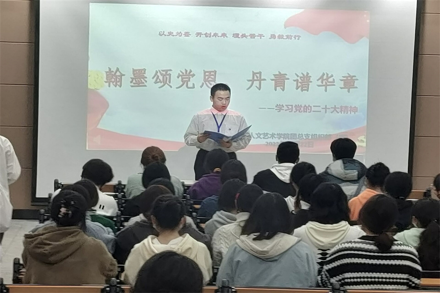 活动开始,全体起立奏唱共青团团歌,团歌嘹亮全场肃然起敬。紧接着,组织部干事周展翅领读团章,22级学生代表龙冉就“翰墨颂党恩,丹青谱华章——学习党的二十大精神”主题团日自由发言,干事徐梦娟上台宣读并讲解主题团日的具体内容与相关要求。最后,由威廉希尔足球官网团总支常务副书记兼学生会主席方浩博就此次主题团日做总结,总结清楚明确,言简意赅,至此活动圆满结束,所有人有序离场。